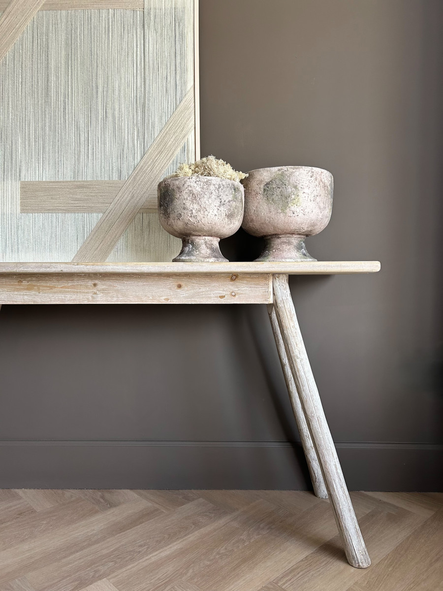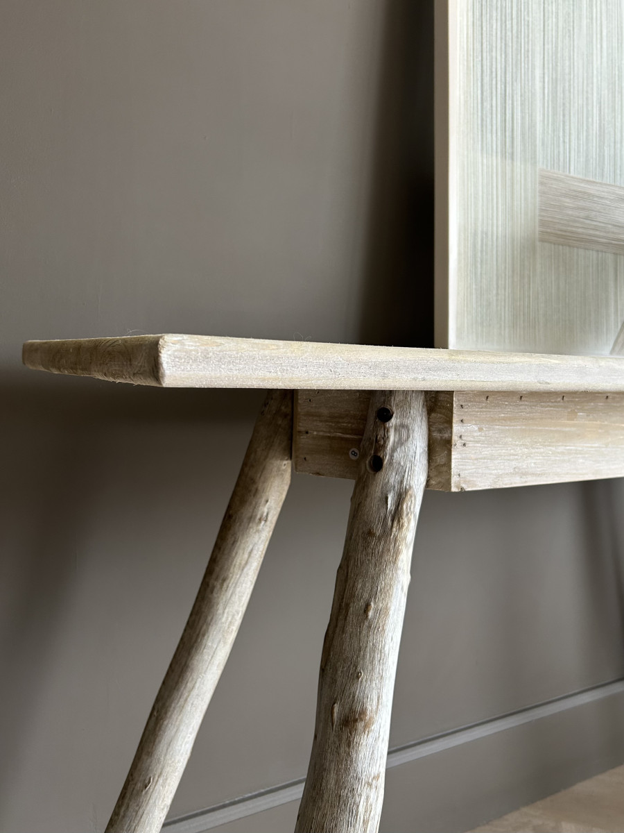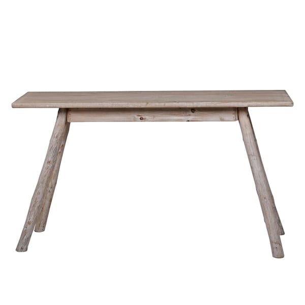 Made from pale-finished fir wood, the console showcases subtle geometric parquet detailing for a refined, textured look. Standing on four uniquely shaped legs for both stability and style, this console table features a slim profile with ample surface space, ideal for displaying décor or creating a stylish entryway focal point.