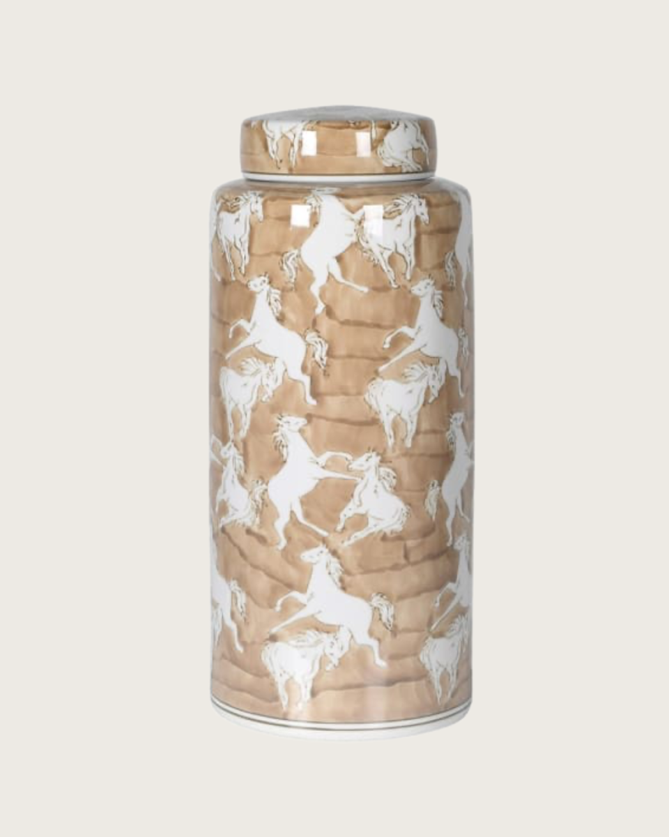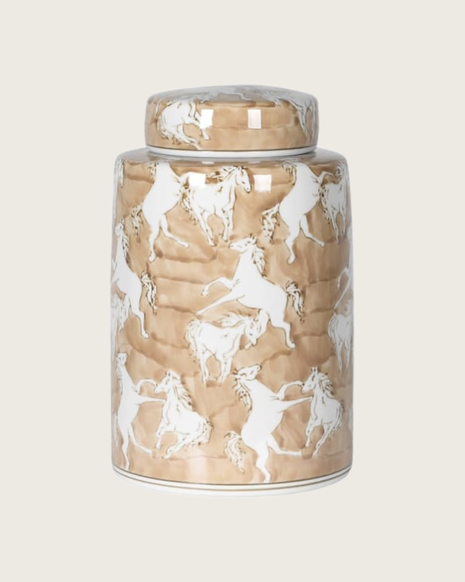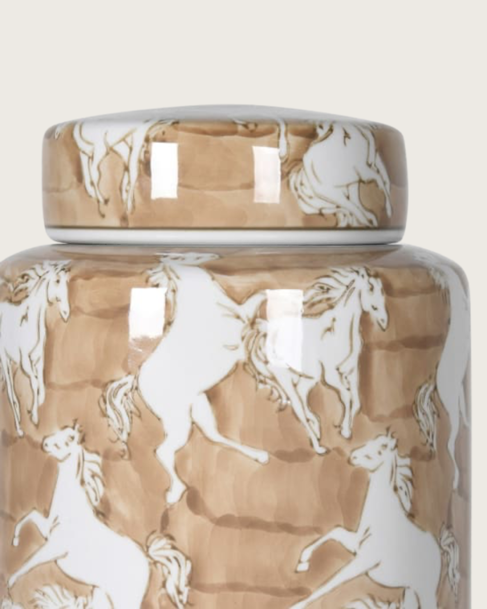Bring a touch of rustic elegance to your home with the Horse Silhouettes Caramel & Cream Lidded Jar. Expertly crafted from ceramic, this decorative jar features graceful horse silhouettes against a warm caramel and off-white background, making it a standout accent piece for any room.