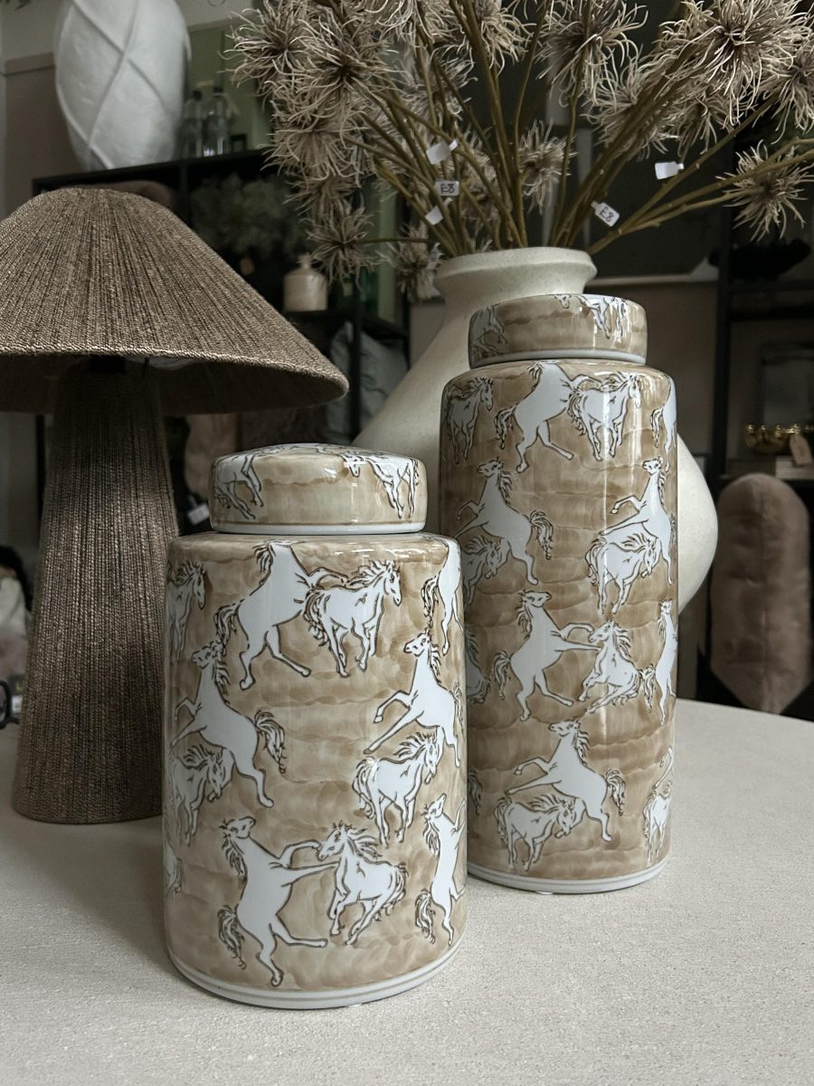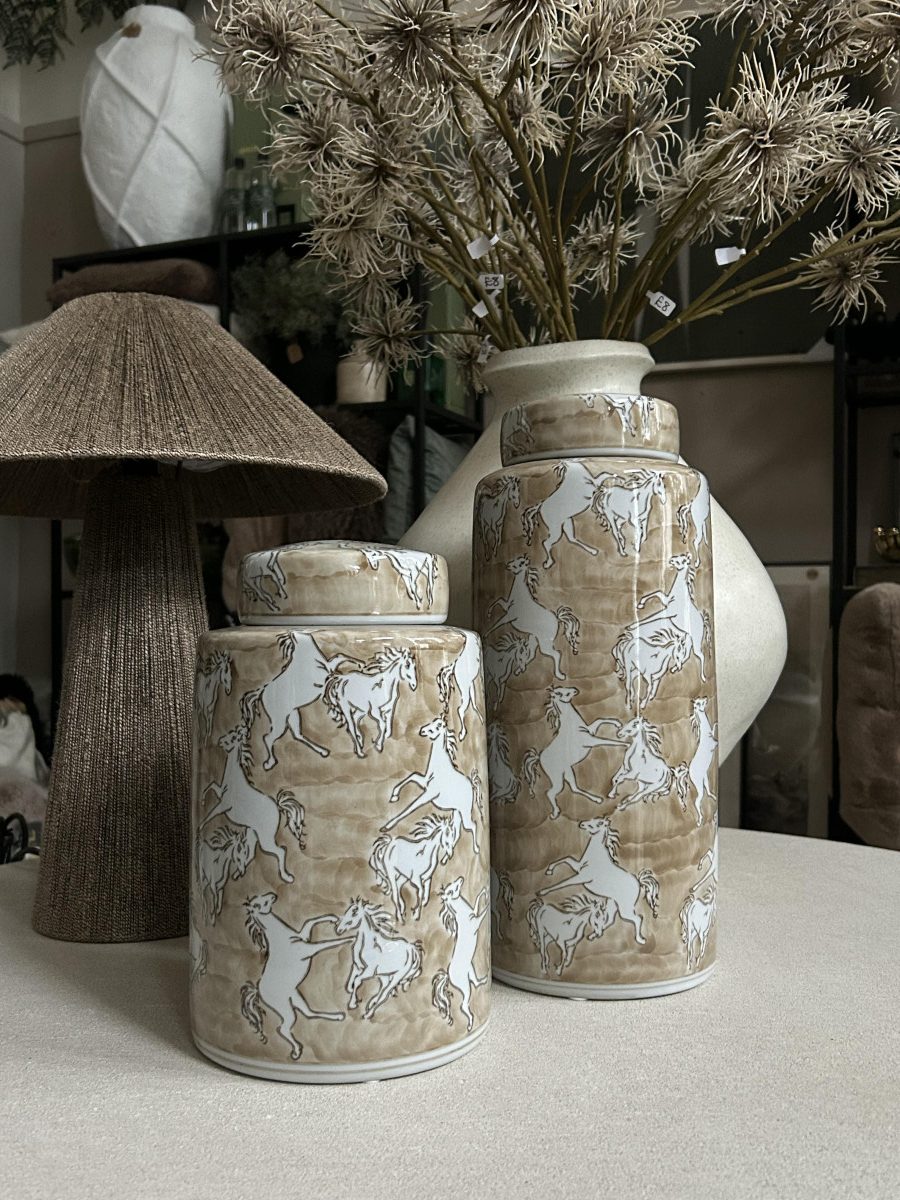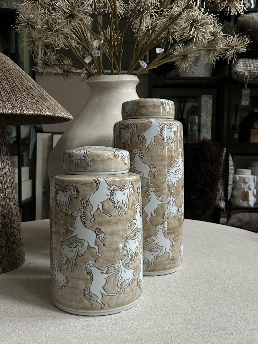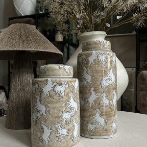 Perfect for consoles, shelves, or sideboards, the lidded design adds both style and functionality. Ideal for lovers of equestrian décor, rustic interiors or natural-toned home accessories, this jar blends craftsmanship with timeless charm.