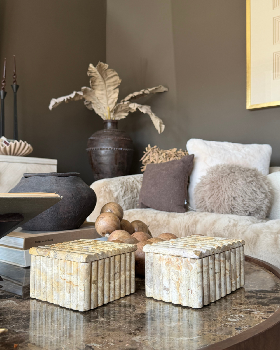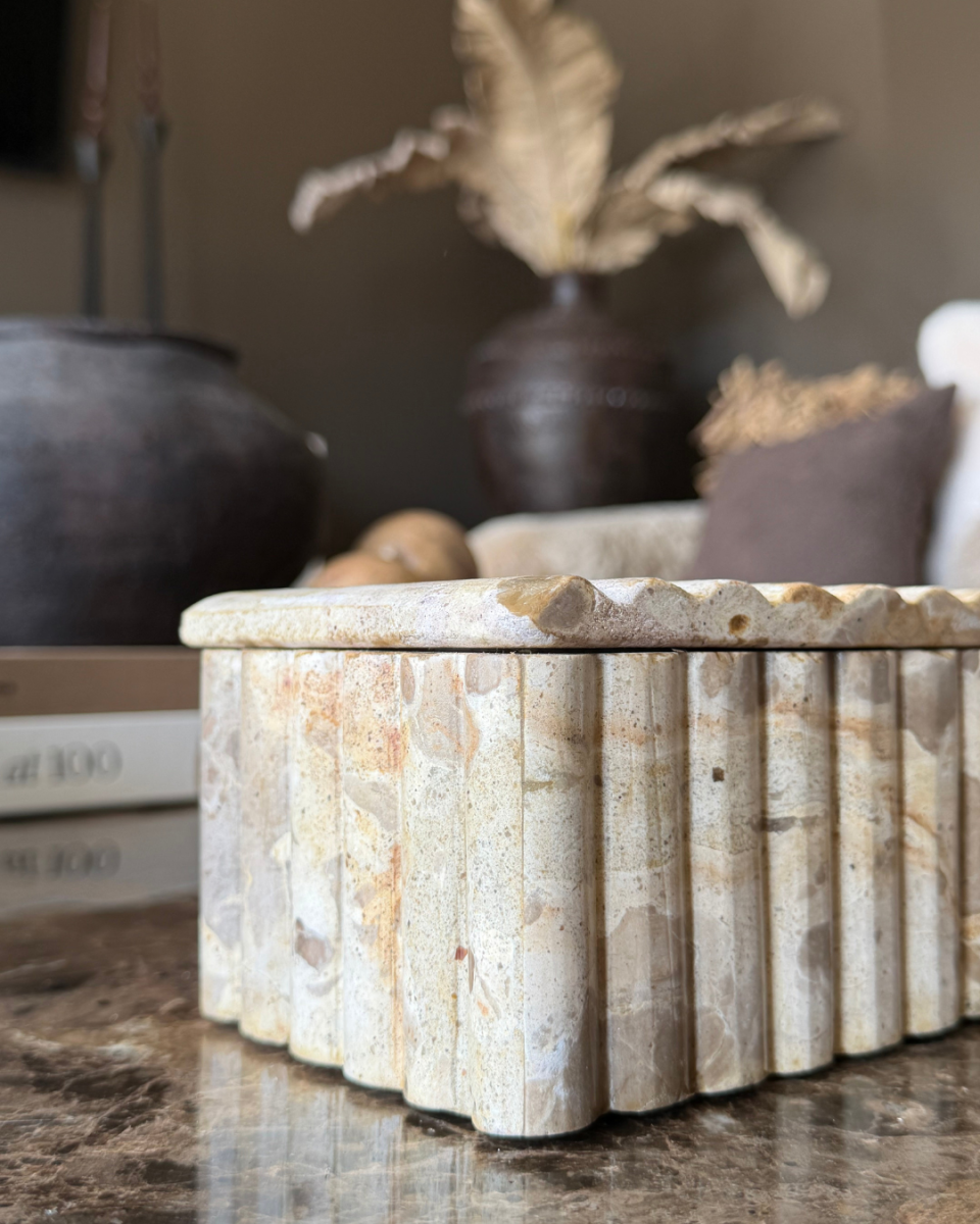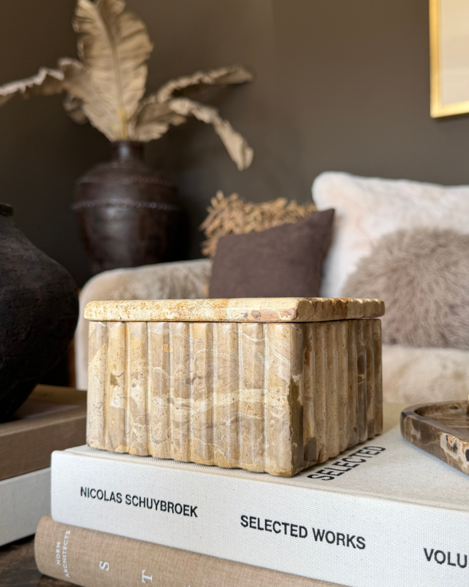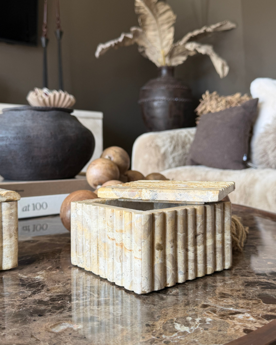 Elevate your home décor with the Caramel Fluted Square Marble Box, a perfect blend of elegance and functionality. Crafted from premium natural marble, this decorative storage box features a warm caramel hue with unique veining, ensuring no two pieces are alike. The fluted design adds a touch of texture and sophistication, making it an eye-catching accent for coffee tables, consoles or bedside styling.