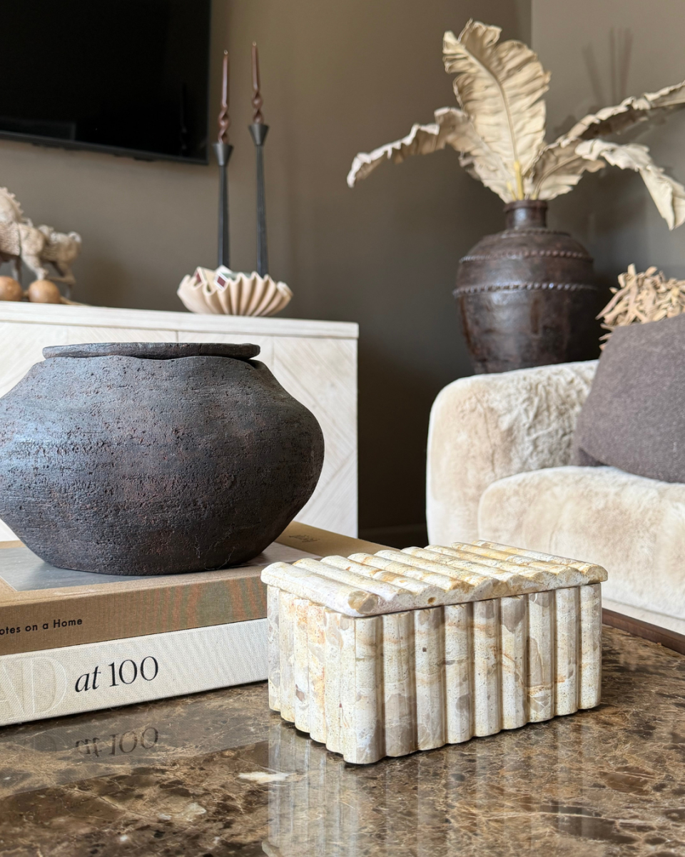 Add understated luxury to your space with the Caramel Fluted Rectangle Marble Box. Expertly carved from high-quality natural marble, this elongated storage box showcases a rich caramel tone with organic patterns that enhance its natural beauty. The elegant fluted detailing brings depth and texture, making it a sophisticated decorative piece for any room.