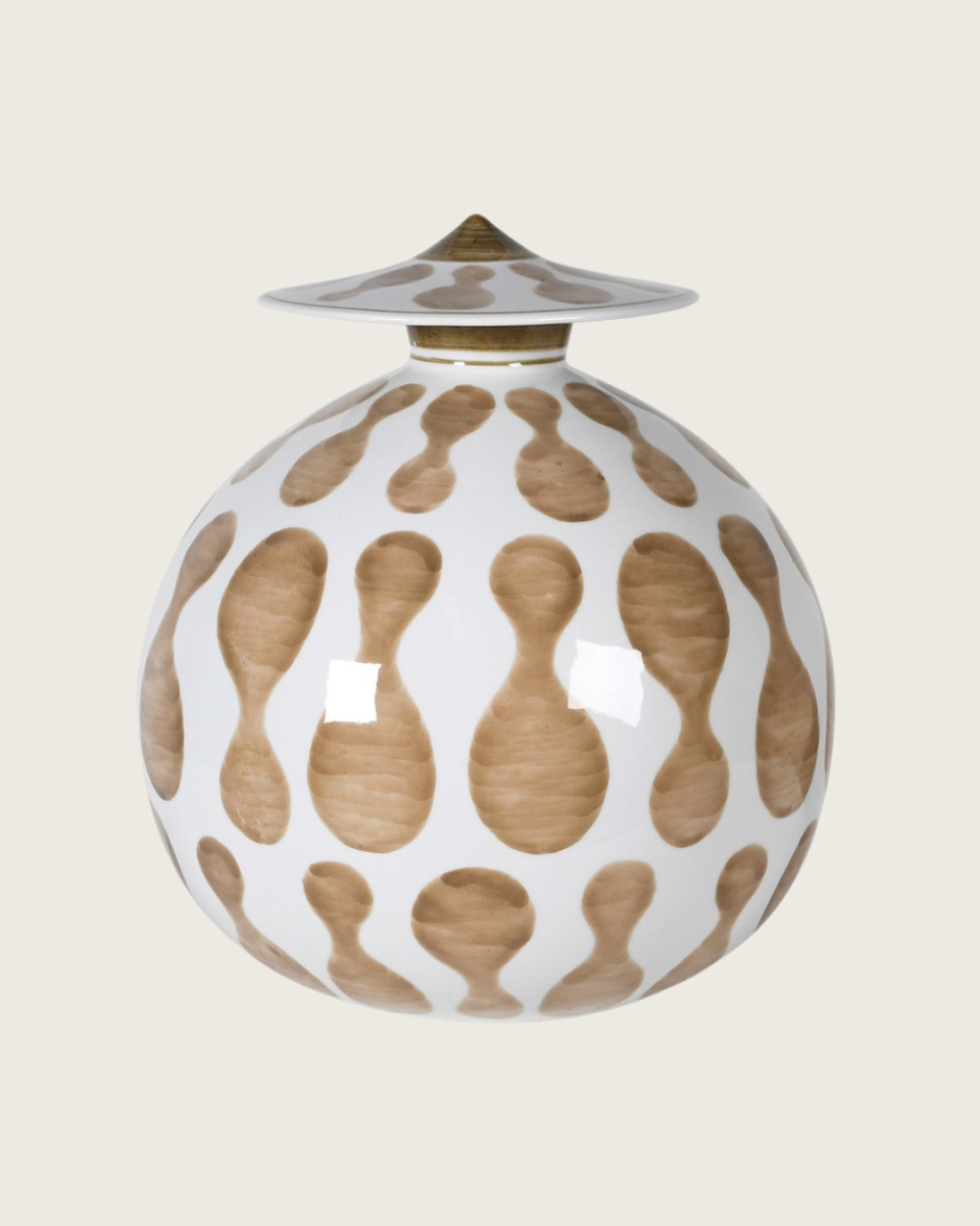 Siena White Brown Coolie Jar is a beautifully crafted decorative accent designed to bring warmth, texture and timeless elegance to any interior space. Featuring a striking white ceramic body with hand-painted brown organic detailing, this statement lidded jar blends modern artistry with classic sophistication. The elegant coolie-shaped lid and rounded silhouette make it a standout piece for styling consoles, shelves, sideboards, coffee tables and entryway displays.