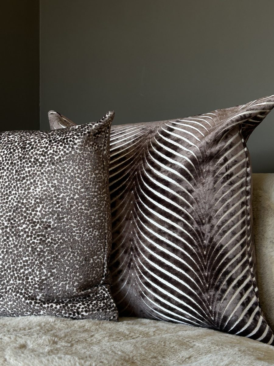 Enhance your home décor with the Paul Moneypenny Twofaced Chocolate and Taupe Cushion — a luxurious double-sided velvet cushion in elegant chocolate and taupe, with taupe piping, combining stylish design and cozy comfort for any living space.