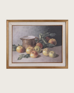 The Apple and Jug Still Life Framed Wall Art features a classic composition of ripe apples and a vintage jug, set against a softly textured background and finished with a refined gold effect frame. This traditional still life artwork adds warmth, character and timeless style to any interior.