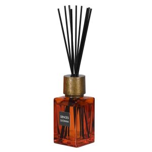 Sences Sienna Mini Reed Diffuser    Sences Sienna Mini Reed Diffuser£20.00 The Sences Sienna Reed Diffuser boasts a dark and spicy scent, with bases of oud and softened with rose it evokes a desert warmth. Packaged in an orange glass bottle with black reeds, this stylish diffuser is perfect for your entrance space or displayed on a sideboard. - H25 D5 cm (height with reeds)