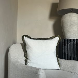 Its white textured centre adds a cosy, inviting feel, while the olive green fringed edges create layered depth and visual interest. Versatile and timeless, this cushion complements a range of interior styles. Whether adding a touch of luxury to your living room or bedroom, the Hugo Cushion is a stylish accessory that elevates any space.
