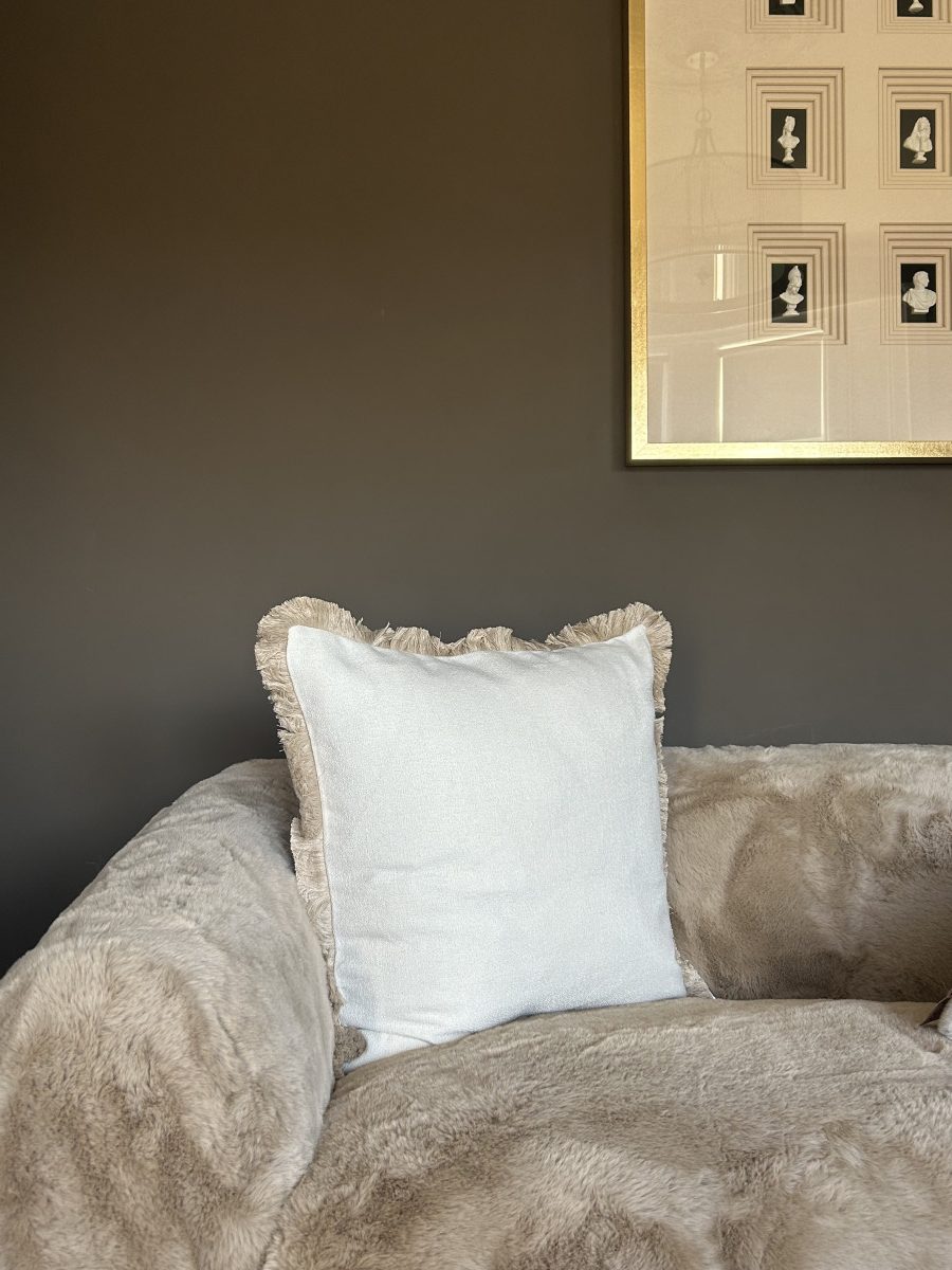 The Elodie Taupe Velvet Fringe Cushion blends timeless elegance with modern sophistication.