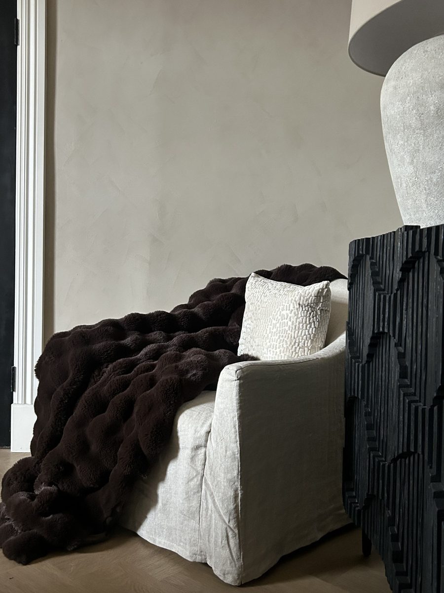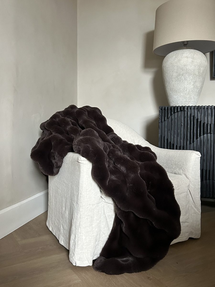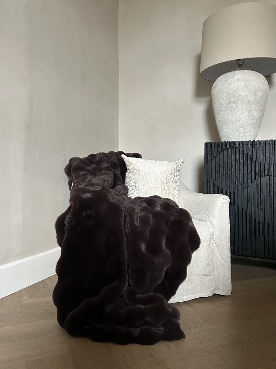The dense, fluffy pile offers irresistible softness, making it ideal for layering on sofas, armchairs or beds. Its deep chocolate hue adds depth and warmth while complementing a wide range of neutral and earthy palettes.